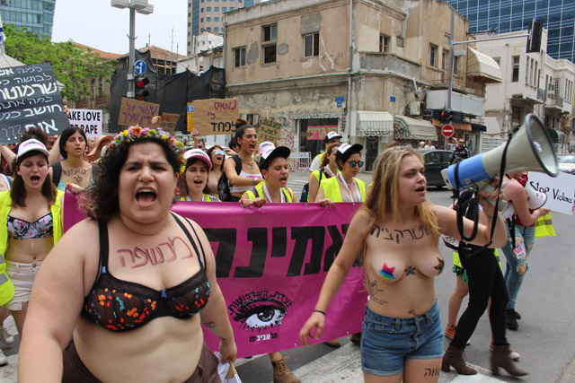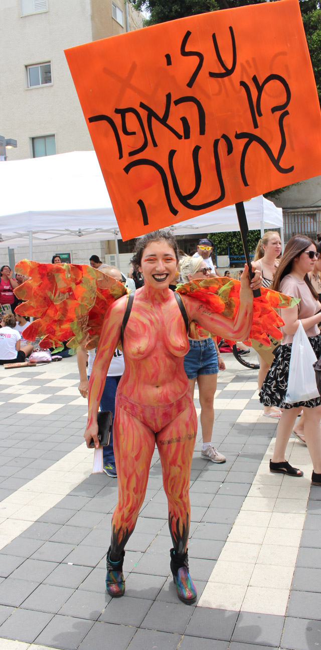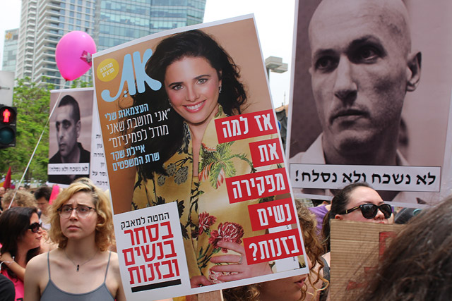 Участники марша в этом году несли плакаты с изображениями тех, кто подозревается в домогательствах или был осужден за сексуальные преступления, а также портрет министра юстиции Айелет Шакед, которую они обвиняют в том, что она не защищает права женщин.