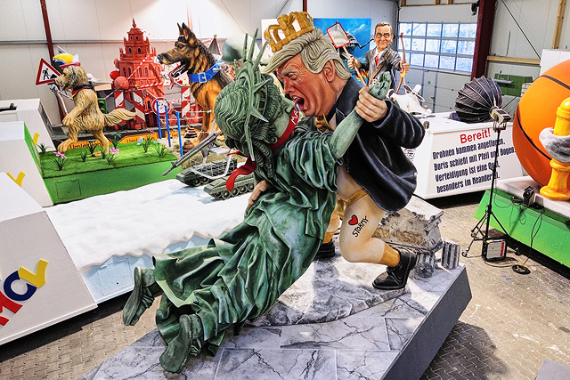 По традиции на этом уличном шоу демонстрируют карикатурные фигуры политиков – как немецких, так и зарубежных. Среди наиболее заметных кукол – американский президент Дональд Трамп во фривольном танце со Свободой, а также в интимной позе для подобострастных целований, германский канцлер Фридрих Мерц за штурвалом и прочие, и прочие.