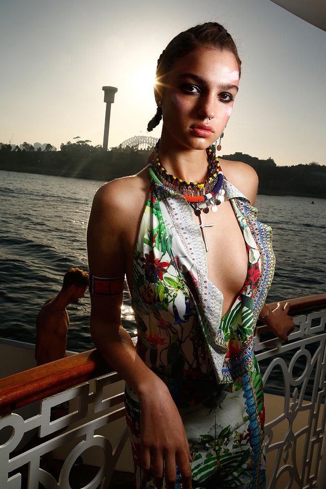 Модели – парни, девушки и малыши – представили расписанные вручную этнические наряды под звуки африканских барабанов на палубе яхты, откуда открывался вид на Сиднейский оперный театр.